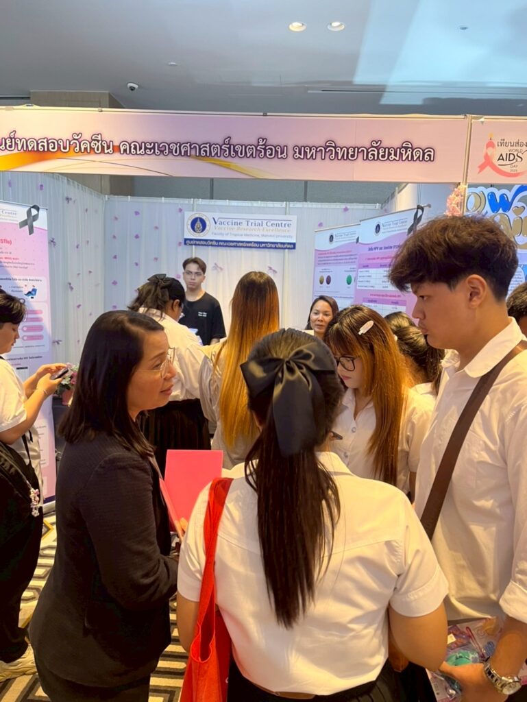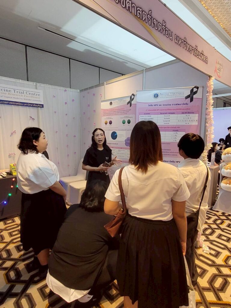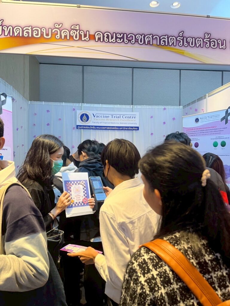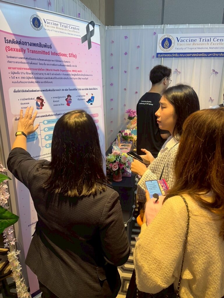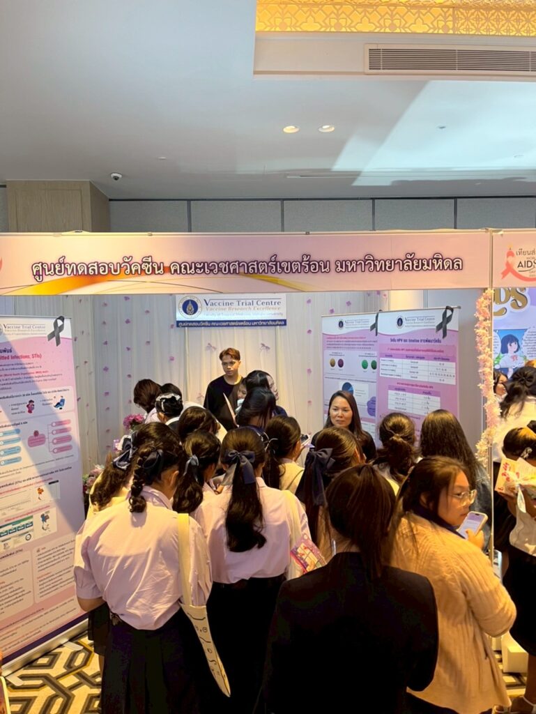 The Vaccine Trial Centre hosted an information booth providing educational materials on sexually transmitted infections (STIs) such as HIV and HPV (a major cause of cervical cancer), HPV screening, HPV vaccine development, and HPV vaccines currently approved in Thailand. The booth also featured interactive question-and-answer activities to engage youth and the general public, aiming to raise awareness and promote accurate understanding of STI prevention and HIV/AIDS prevention.