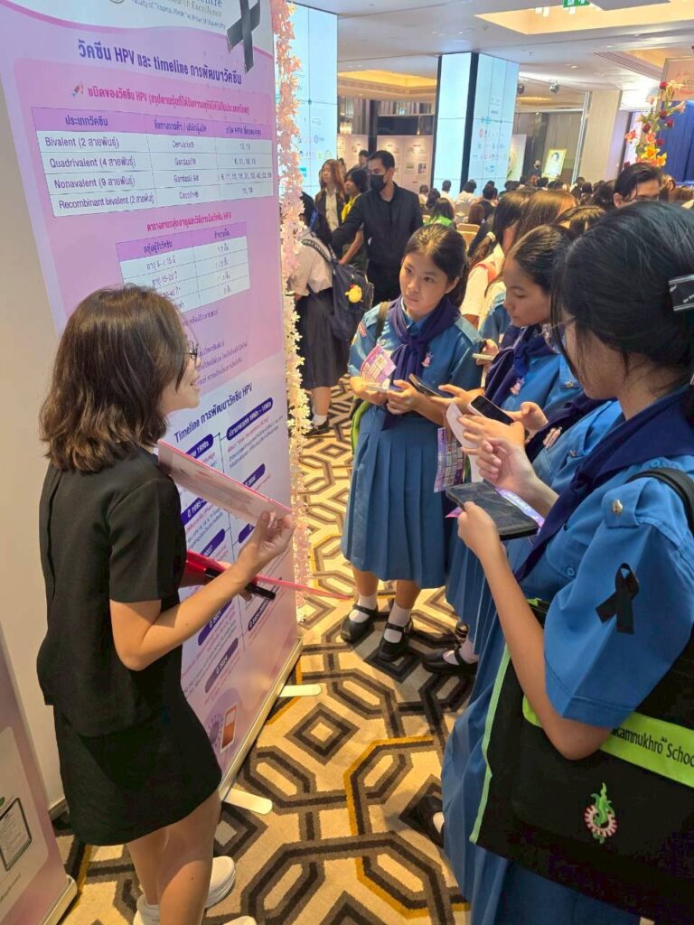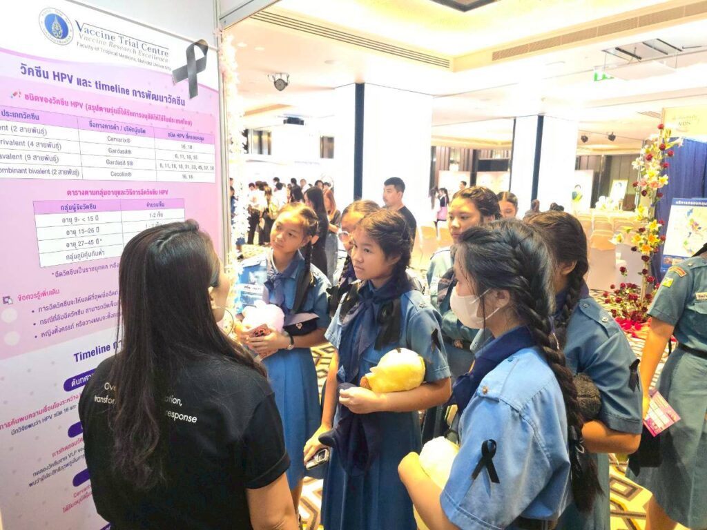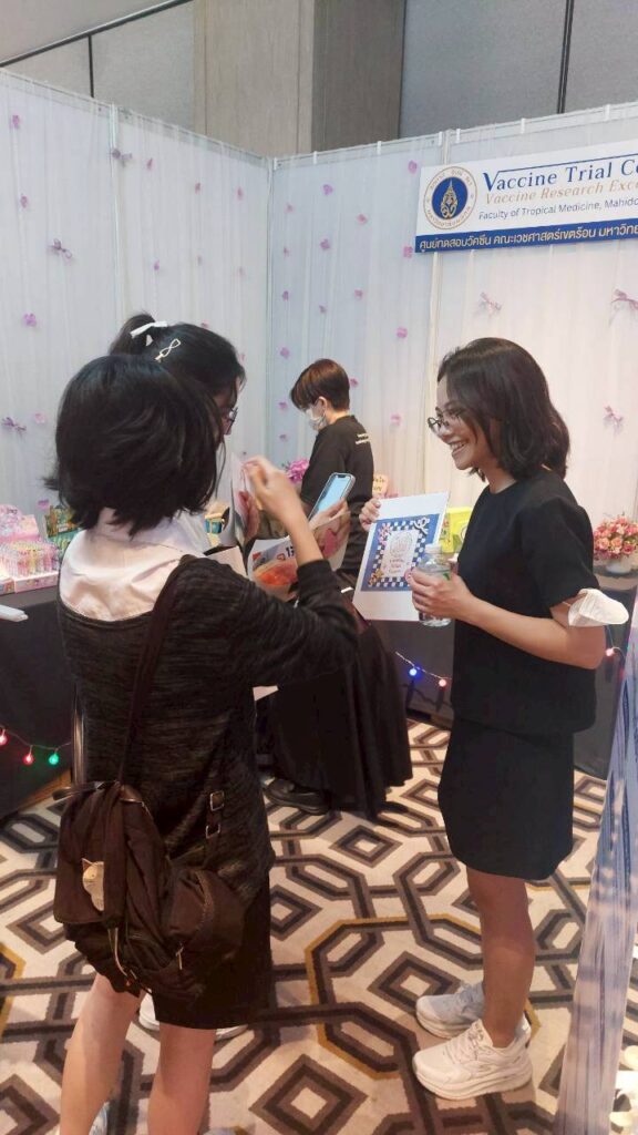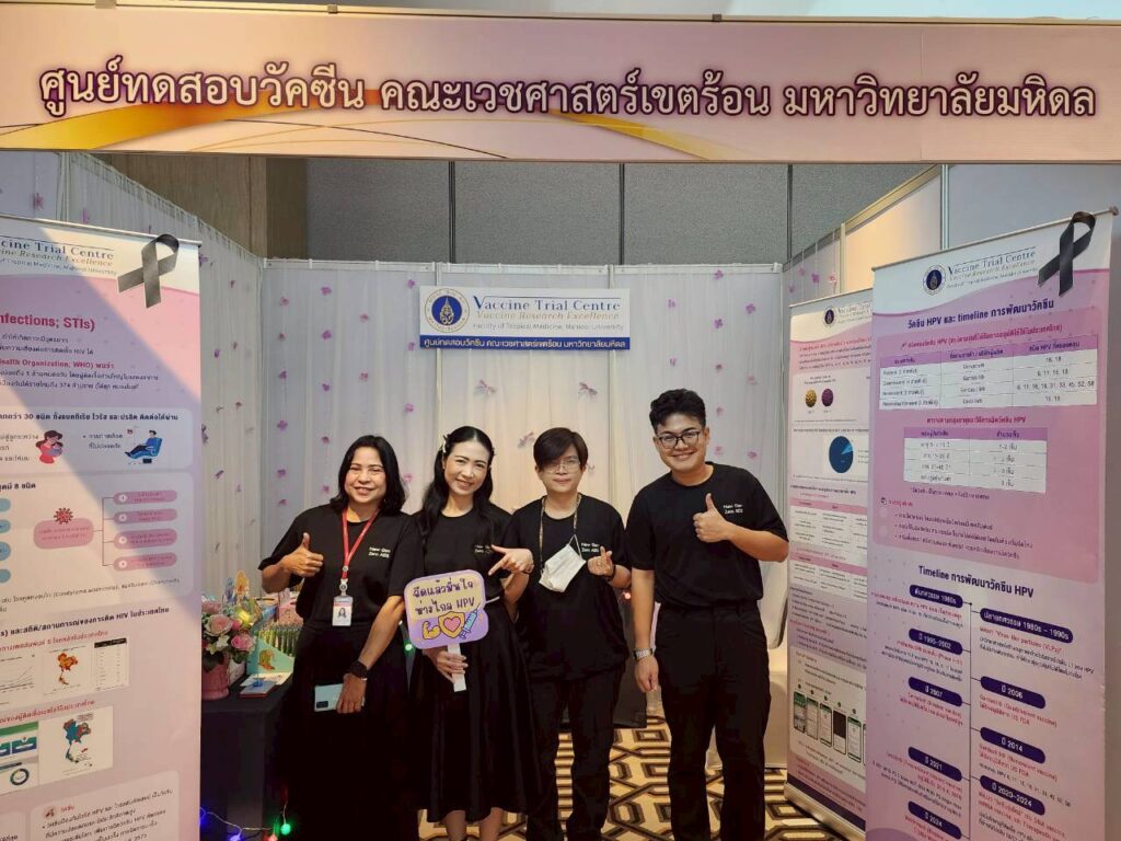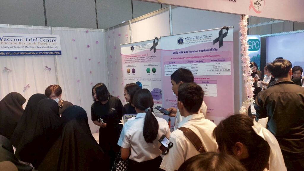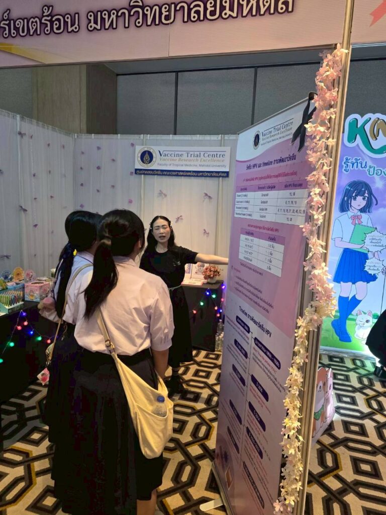 The Vaccine Trial Centre hosted an information booth providing educational materials on sexually transmitted infections (STIs) such as HIV and HPV (a major cause of cervical cancer), HPV screening, HPV vaccine development, and HPV vaccines currently approved in Thailand. The booth also featured interactive question-and-answer activities to engage youth and the general public, aiming to raise awareness and promote accurate understanding of STI prevention and HIV/AIDS prevention.